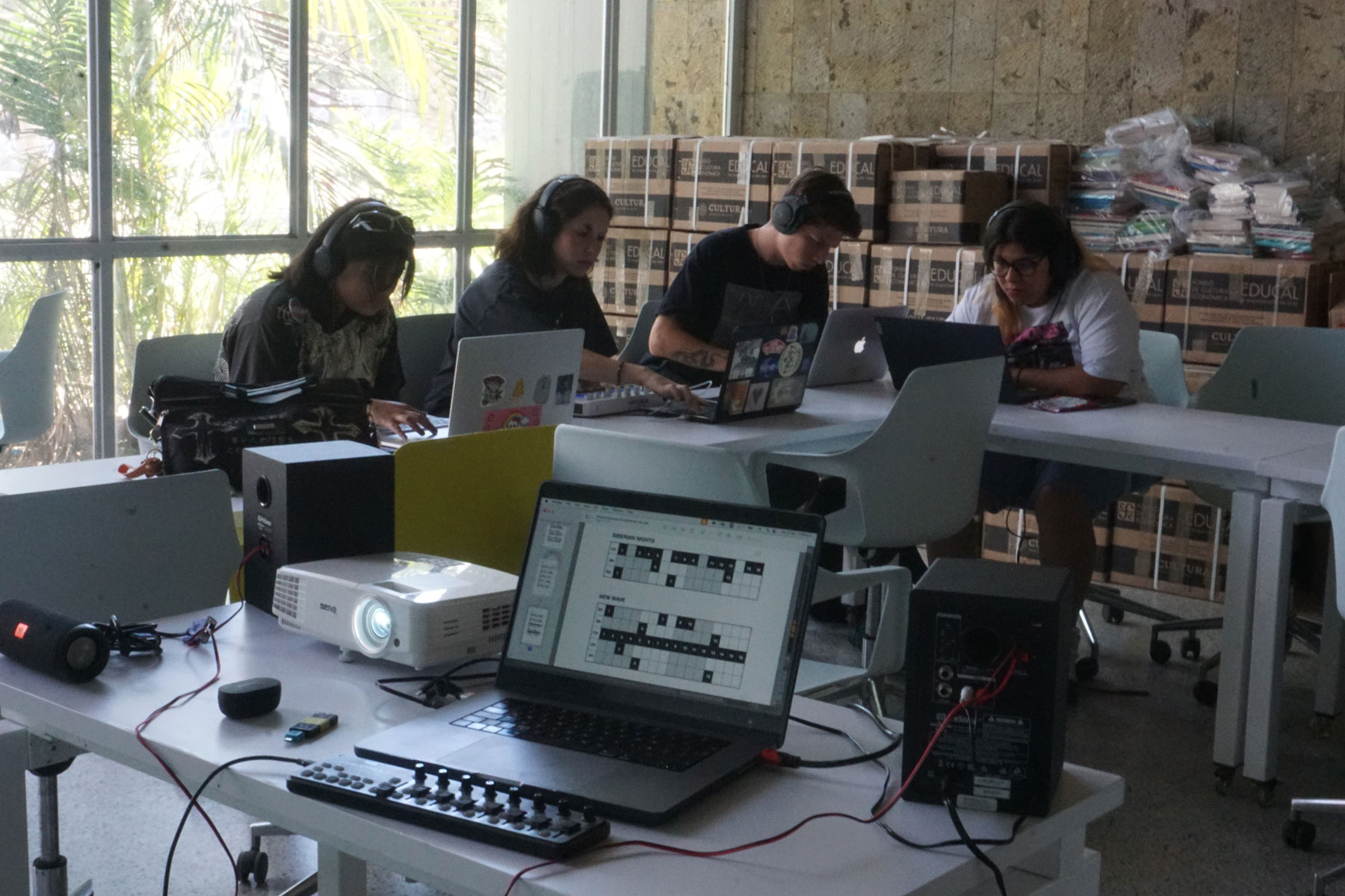 Caja de sonidos. is a project focused on the creation and production of urban music, encompassing a wide range of contemporary genres and aesthetic approaches. The workshop aims to develop key creative skills among participants, particularly rhythm through beatmaking, using a variety of music production tools. In parallel, it emphasizes the use of language, introducing concepts for writing rhymes, bars, phrases, and poetic elements, as well as techniques for recording and performing original lyrics.